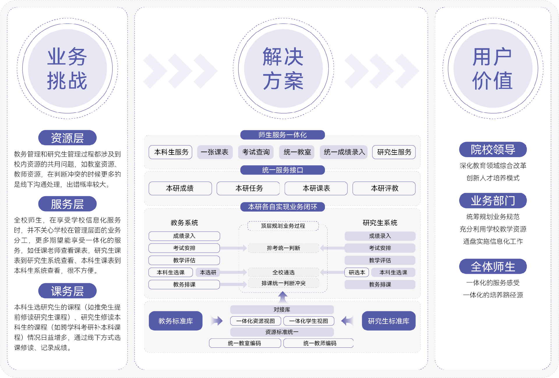 本研一体化首先需要充分满足师生服务一体化的服务要求,屏蔽掉业务内部流转的复杂性,让师生享有更加顺畅便捷的服务。同时在构建管理服务时,需要充分尊重本研业务各自特点,在后端支撑管理部门构建时需要能够支持差异化的管理。最终打破本研壁垒,建成覆盖教学运行、科研活动、实践环节、资助体系的全方位一体化支撑,实现本硕博贯通培养。