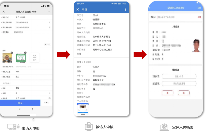 传统校门访客管理存在诸多漏洞,外来访客随意进出,校园安全缺乏保障,疫情期间,防控风险增大。为加强进出校人员管理,实现对教职工、学生、外来人员进出全掌控,学校借助疫情防控平台实行申请、审批和备案全管理流程。