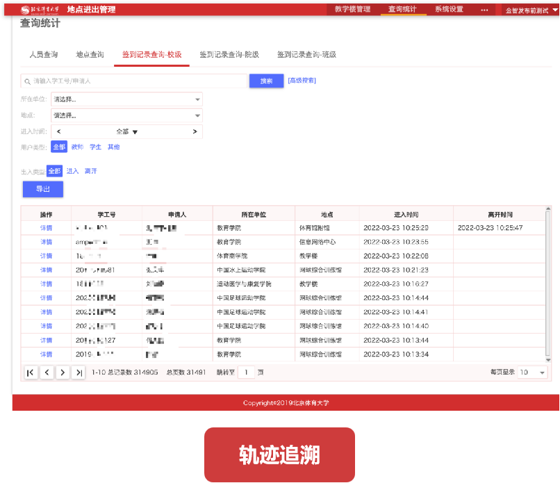 借助场所码、人脸识别闸机、一卡通、WIFI等相关数据汇集,实现对4个校门,14个学生公寓,教学楼,各类场馆人员行动轨迹的精准定位,做好人流控制和精准追溯准备。通过疫情防控平台全面记录人员进出时间、停留时长等轨迹信息,提供实时查看功能,根据疑似疫情人员轨迹,第一时间确定相同时间范围的同行人员,从而找到疑似次密接高危人群,实现校园全域轨迹可追溯。