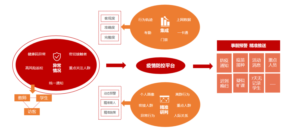 为及时掌控健康码异常、密切接触者、重点关注人群等异常情况,学校借助疫情防控平台,通过对相关人员的各类数据挖掘,自动识别潜在风险,实现前置风险管理。