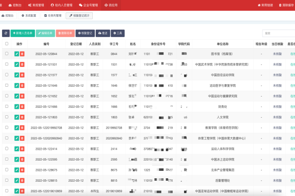 疫情防控常态化管理期间,全员核酸检测作为疫情防控的一项重要工作,如何做到应检尽检,不漏一人,北体通过大数据筛查当日在校师生人员明细,一键核查人员名单准确性,根据数据计算模型自动关联当日师生核酸情况,可迅速筛查未检测人员,设置精准推送提醒,实现在线核查校内师生每日核酸执行情况,高效支撑1.6万余在校师生每日核酸检测工作的合规性分析。