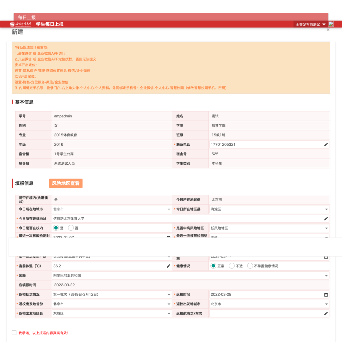 从师生易用、调整灵活的角度考虑,采用企业微信+PC端多种填报方式设计,实现随时随地快速填报。在打卡服务上增加数据记忆功能,基础信息一次填报即可自动带出,动态信息简便填写,从细节着手,让师生感受人文关怀。打通每日健康打卡定位信息,确保上报数据的真实性,为快速溯源与精准排查提供保障。