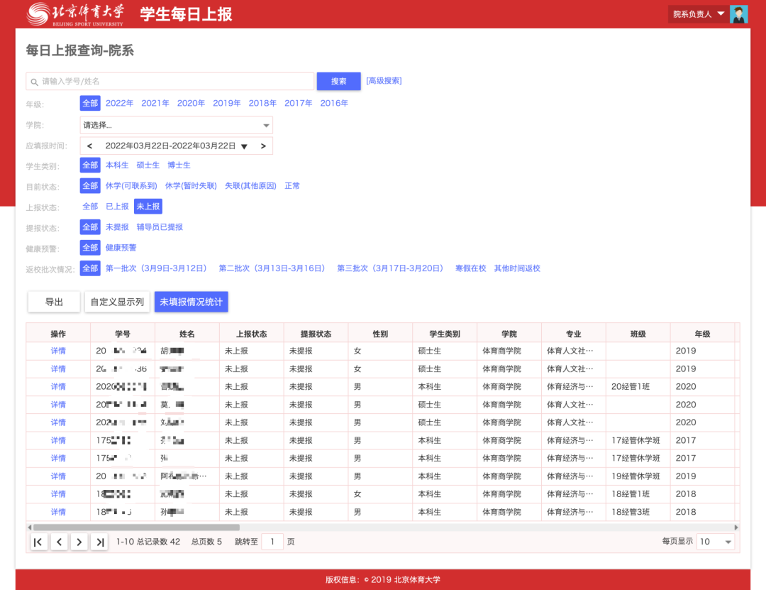 信息化“疫情防控平台”已在北体全面激活,通过不断的应用与改善,持续建立起高效的信息化服务保障体系,未来平台将不断助力校园疫情防控工作更加精准高效运转,为全面打赢疫情防控阻击战贡献一份力量。
