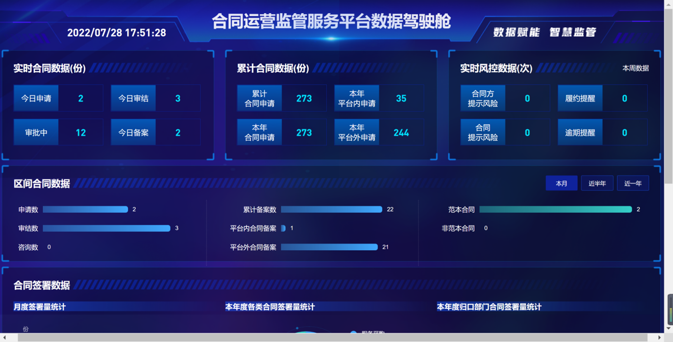 通过时间维度、部门维度和合同类别维度对流程数据、业务数据、风险数据进行全面分析,以科学的数据模型为依托,助力合同管理数据化。
