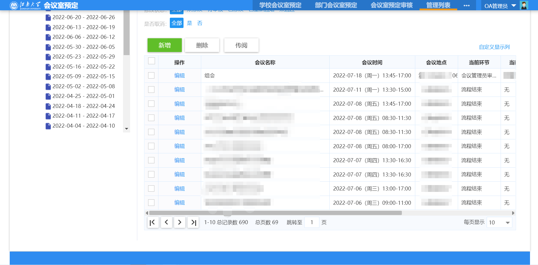 会务:围绕学校会务提供会议室预定、周会表、会议通知、议题管理、会议签到、会议进程、会议纪要、会议排座等全生命周期的管理。