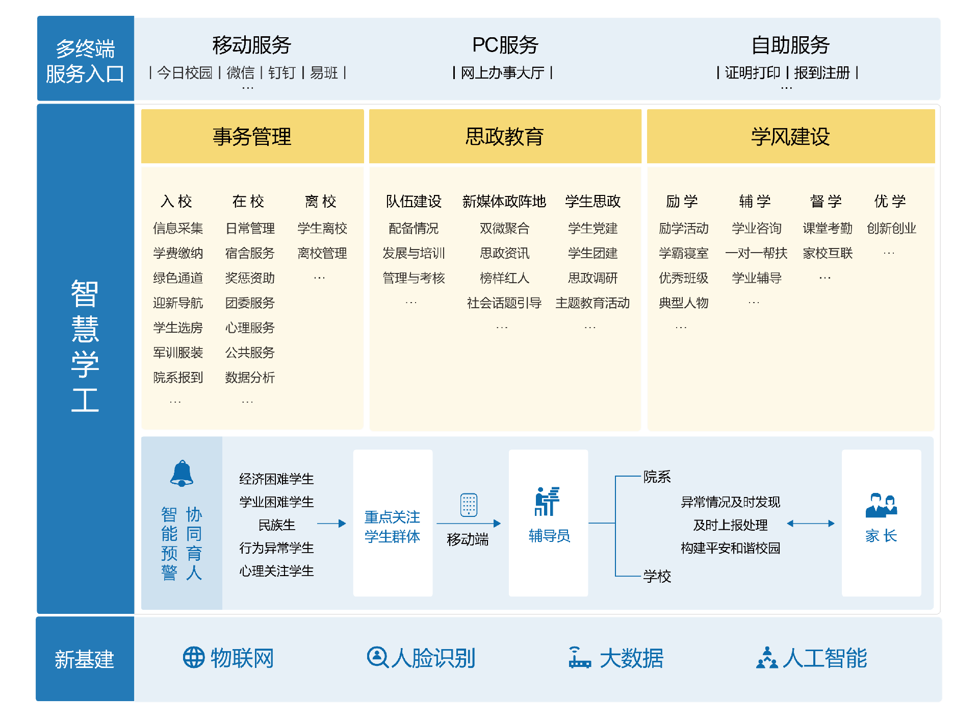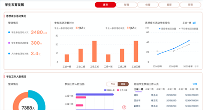 2021年,金智教育运用信息化、互联网与大数据技术,结合北京邮电大学前期建成的学生工作管理服务平台、数据门户、教师学生一张表及一站式服务大厅,对学工平台进行升级和创新,以价值为导向,关注“人”本身,促进多维度业务数据聚合,帮助学工精细化管理的颗粒度更细,数据统计分析业务域更广,助力北京邮电大学学工信息化建设实现以“核心业务为主”向“以人为本·数据驱动”的转变,从而提升育人成效。截止目前,学校学工系统总访问量已超33W+,总访问人次20W+。打通16个部门、410项本科学生数据、485项研究生学生数据,共计2650万条的庞大数据群,全方位记录学生成长描绘成长印记、刻画成长周期,进行群像分析、探索科学规律。