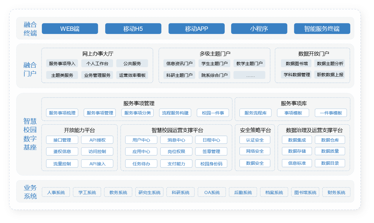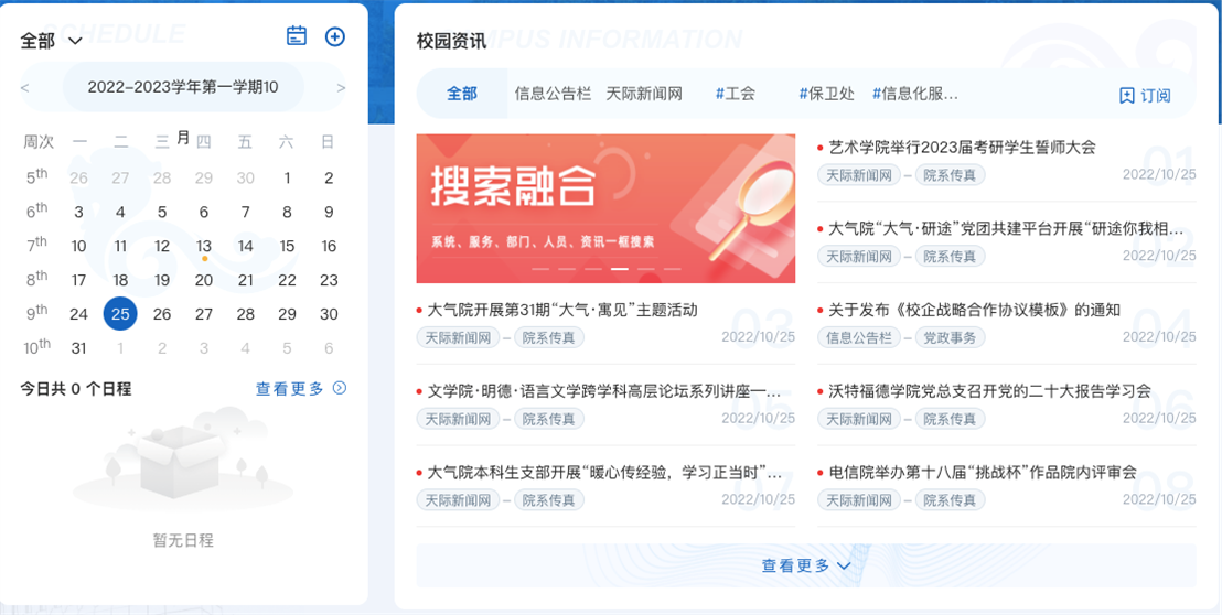 融合门户:融合门户对校内各类信息和应用系统进行整合,支撑多主题PC门户、移动H5门户和门户小程序构建,为用户提供统一的访问入口;基于API网关提供预置的日程、待办、消息、第三方电子签章的能力开放,简化异构系统集成工作,实现校园信息系统的深度融合,面向全校师生提供一体化、一站式、个性化信息服务。