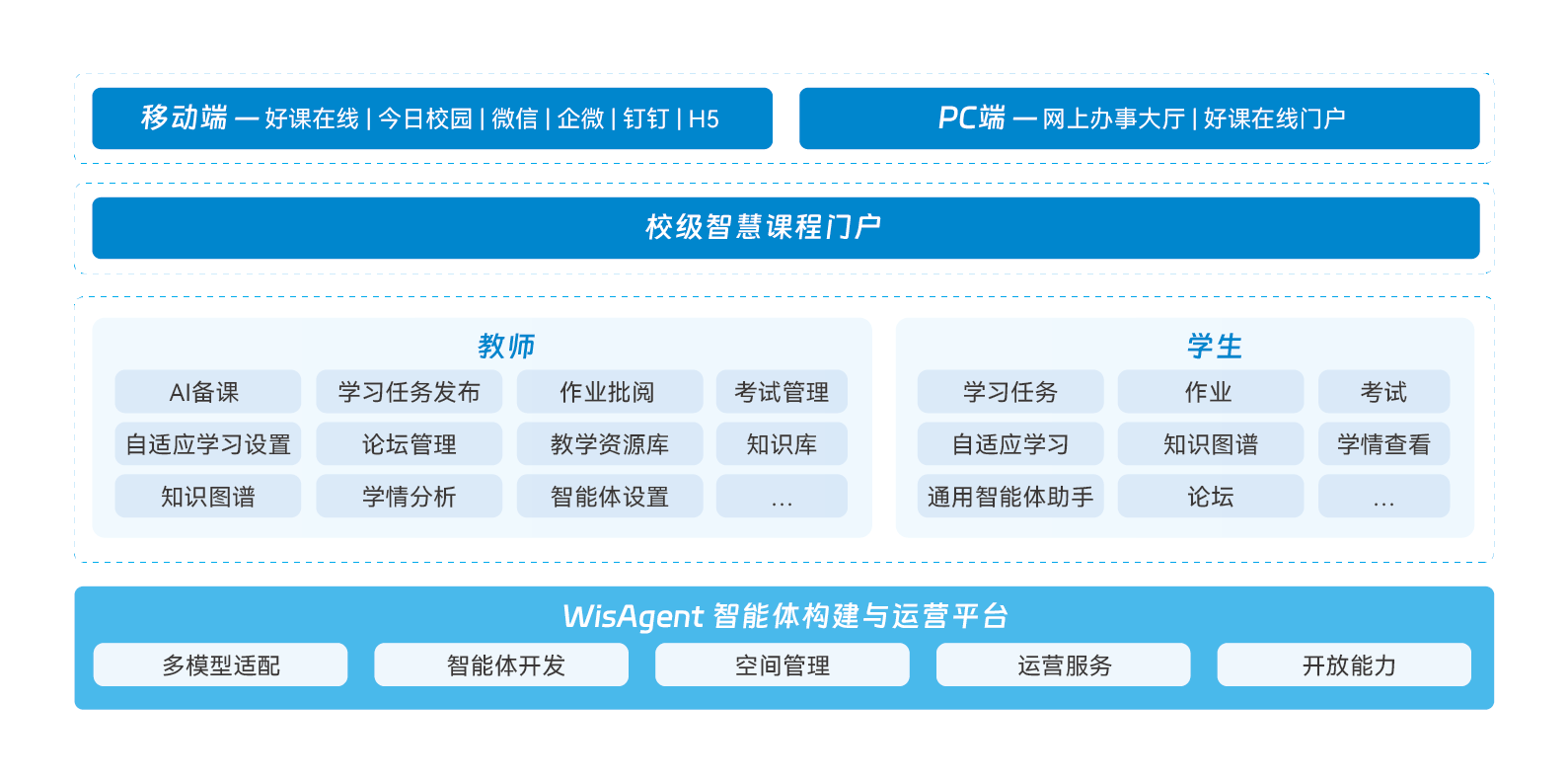 AI教学一体化SaaS平台具备多终端、全流程、一体化、高灵活的特点,为AI智慧课程建设提供全面智能、安全、可靠的技术支撑,助力人工智能赋能教育形成师/生/机三元互动新模式,深化人工智能全面赋能教育多场景应用。